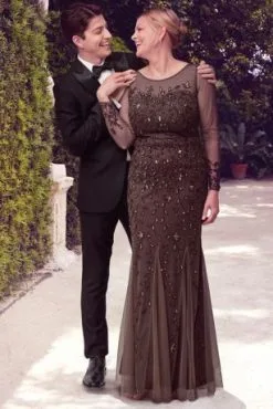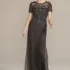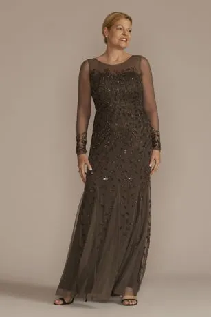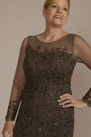 Opulent beading artfully embellishes this sheath dress, but leaves an especially memorable mark on the illusion neckline and sleeves. The godet hem skirt adds volume to your every move.