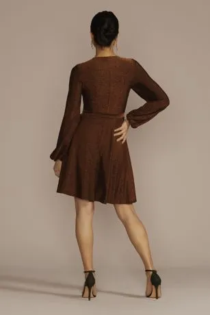 Get wrapped up in shimmering metallic fabric on this short A-line dress featuring long bubble sleeves, a flowy skater skirt, and tie at the waist.