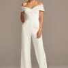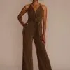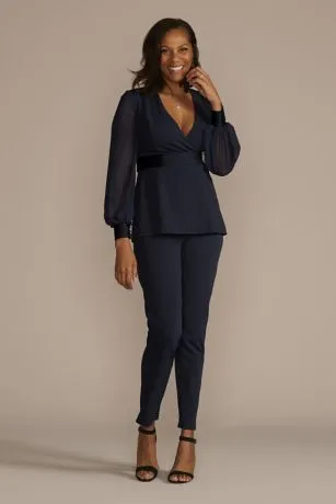 This sleek crepe pantsuit adds feminine flair with sheer long sleeves, a stunning V-neckline, and embellished satin belt. Wear to an upcoming special occasion or your next night out for a memorable look.