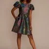 Sparkle lace makes its mark on this elegant sheath dress, designed to look lovely on any mother of the bride or groom. The scoop neck bodice is finished with a delicate tulip hem, and goes hand in hand with the long-sleeve peplum jacket that’s perfect for ceremony coverage.