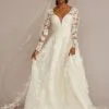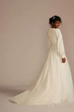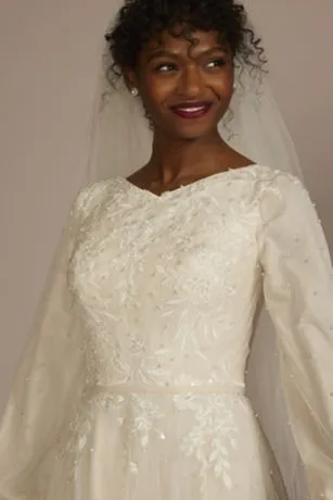 The soft romance of long billow sleeves meets the timeless elegance of a high, modest neckline and full skirt in this pearl-covered tulle A-line wedding dress. Beaded lace appliques complete the look.