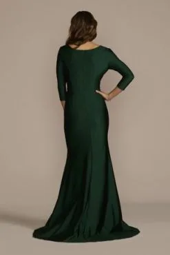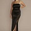 An elegant choice for prom or your next special occasion, this stretch satin sheath dress frames your figure just right, and with a dramatic train, you’ll leave a memorable impression.
