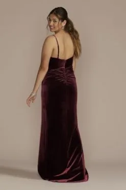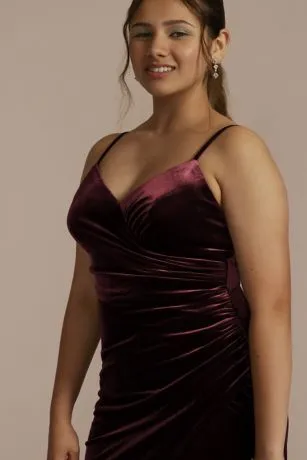 Velvet feels so romantic on this long wrap style dress, but sexy details take it up a notch. The soft fabric gathers at the waist, a sexy thigh-high slit reveals some leg, and backside ruching makes for a memorable exit.