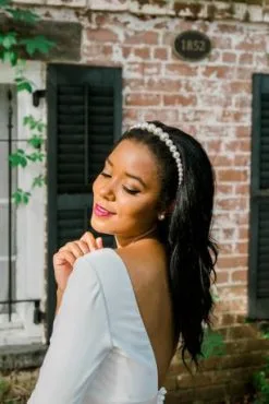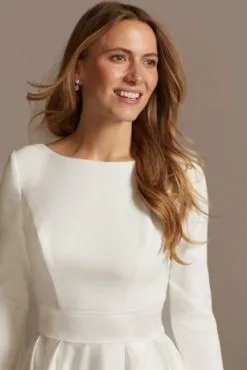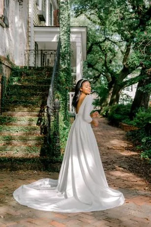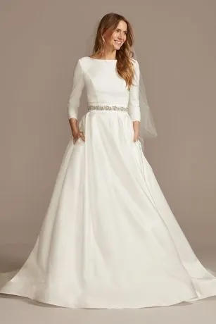 Modern yet classic, this unadorned wedding dress is the height of luxury. Two rich fabrics, stretch crepe and satin, create a fitted 3/4-sleeve bodice, complete with a low back, and a dramatic ball gown skirt.