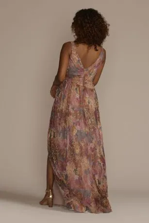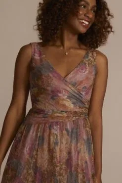 Colorful florals bloom on shiny metallic fabric, making this A-line dress an outdoor occasion must-have. Draping near the waist highlights your natural curve to create an enviable silhouette. Double the shine with your favorite accessories!