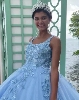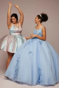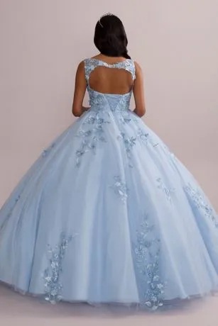 Live your modern fairy tale dream in this enchanting quinceanera ball gown with a keyhole back. Ethereal metallic appliques cover the bodice and scatter down the shimmering glitter tulle skirt, creating enough sparkle to catch everyone’s eyes.