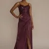 Perfect for formal occasions, this wow-worthy sheath dress is crafted with sleek shining metallic fabic, with a draped halter neckline and ruching at the waist. A dramatic skirt slit adds a sexy detail.