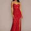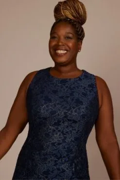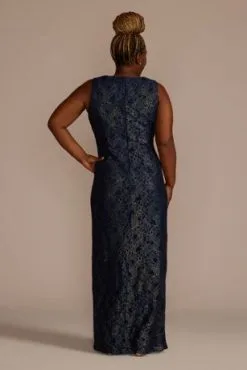 Metallic threads bring shine to floral lace fabric on this stunning sheath designed for mom. Show off in the tank silhouette alone, or add the chiffon cape for chic coverage. A slit completes the look.
