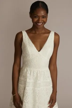 A full midi-length skirt is a beautiful option for garden nuptials or a daytime bridal shower. Charming lace trims the V-neckline, accentuating the corset-like detailing at the bodice, and the banded skirt adds a fun modern take on a classic silhouette.
