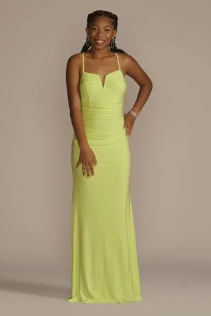 Effortlessly chic, this sheath was designed with details to flaunt at prom or your next big night! A notch adds interest to the V-neckline, while ruching and jersey fabric work together to highlight your curves.