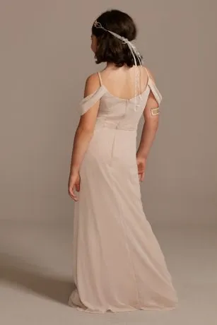 Draping at the sleeves, a spaghetti-strap V-neck bodice, and a statement ruffle give this chiffon junior bridesmaid dress a modern boho feel.