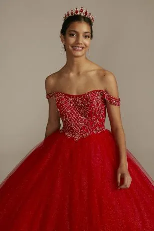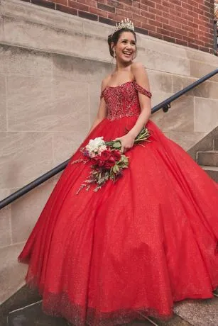 Celebra tus quince anos con estilo! A beautifully beaded bodice with off-the-shoulder sleeves sits atop the full ball gown skirt of your dreams. Glitter tulle will have you feeling like a princess as you twirl across the floor throughout your day.