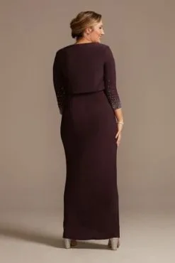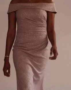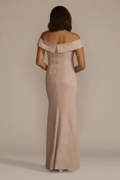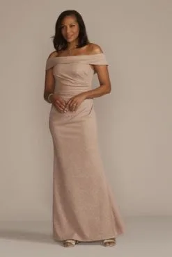 No doubt about it, Mom will love how her figure shines in this sheath silhouette featuring glitter knit fabric that drapes effortlessly to one side. An off-the-shoulder neckline adds an extra dose of modern femininity.
