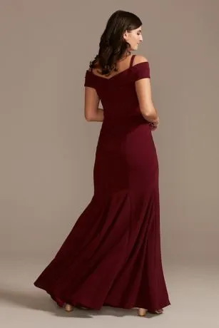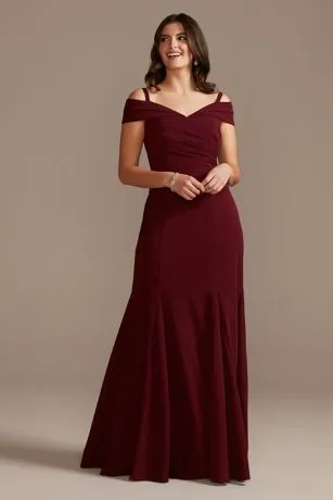 This romantic crepe dress is full of lovely details like off-the-shoulder cap sleeves, a sweetheart neckline, and flattering ruching at the bodice.