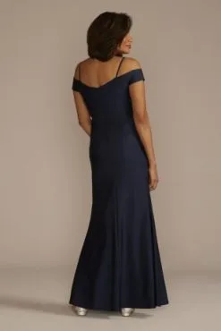 This off-the-shoulder sweetheart sheath dress is just right for every effortlessly elegant mom. Crystal buttons add even more shine to the ruched light-catching fabric for a one-of-a-kind look.