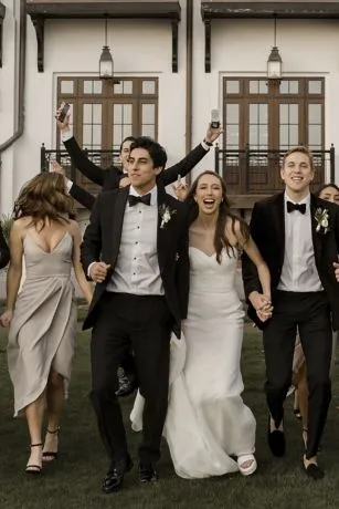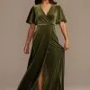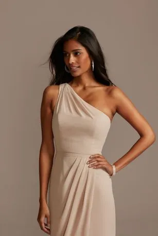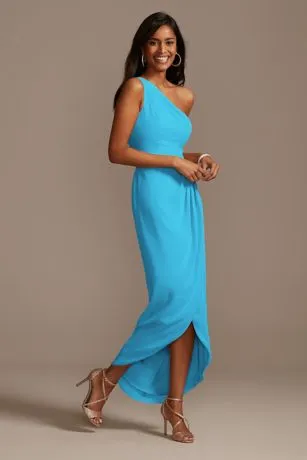 Modern yet romantic, this chiffon bridesmaid dress features a sleek one-shoulder, faux-wrap bodice draped with delicate pleats and a midi-length high-low tulip hem skirt.