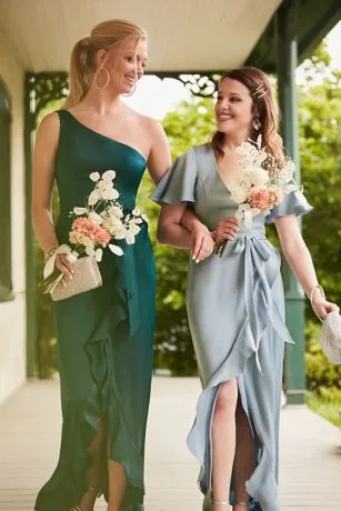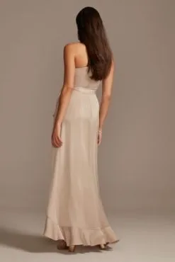 Crafted of crepe-back satin, this bridesmaid dress has a luminous shine from the one-shoulder neckline to the ruffled skirt hem. A tie at the waist adds the finishing touch.