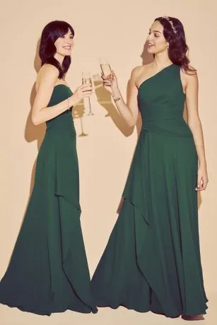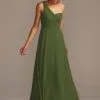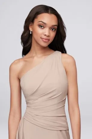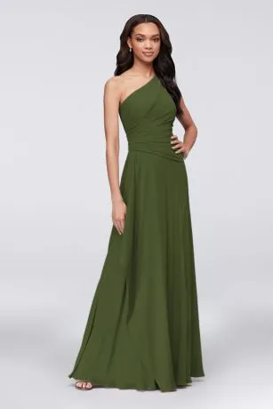 A breathtaking side cascade flows from the asymmetrical draped waistline of this one-shoulder georgette bridesmaid dress. The universally flattering silhouette looks gorgeous on every body type.