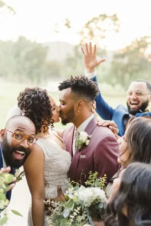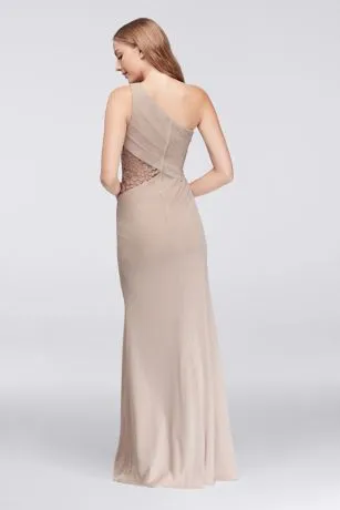 A new take on mesh and lace, a favorite bridesmaid dress pairing, this long soft gown features a sleek side cutout inset with lace.