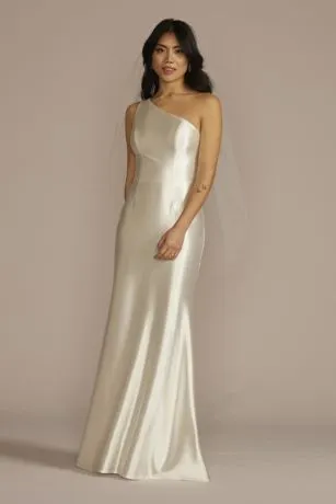 Crafted of lustrous satin, this sexy sheath wedding dress is full of wow-worthy details like a one-shoulder neckline, a strappy back, and a ruched cutout waist.