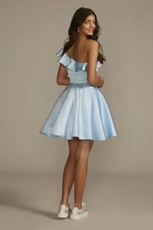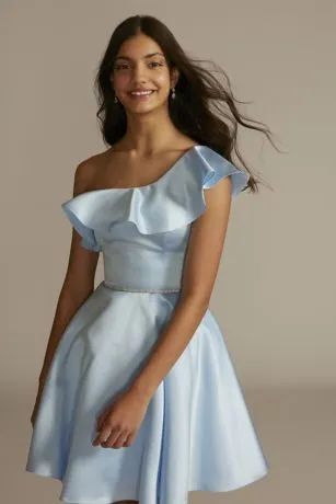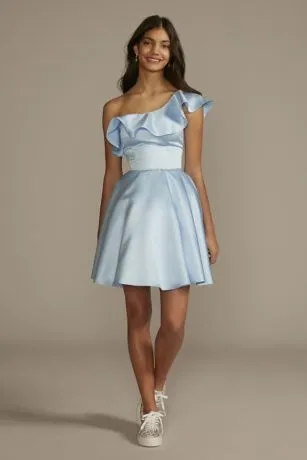 From the quinceanera mass to the fiesta, this mini damas dress is ready to celebrate. A one-shoulder, ruffled neckline brings the drama!