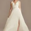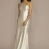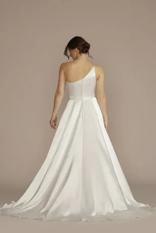 Lustrous satin breathes life into this one-shoulder wedding gown. A banded waist cinches your figure before spilling into a breathtaking chapel train. Keep your essentials at hand in the convenient pockets!