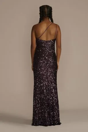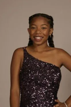 Designed with alluring details, this one-shoulder gown features glistening sequins, sure to keep you in everyone’s view all night long. A skirt slit makes dancing at prom or your next party a breeze.