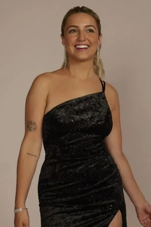At homecoming or your next special occasion, prepare to look “out of this world” while wearing this galaxy-inspired asymmetrical mini! Sparkles enhance smooth velvet fabric, while a skirt slit, one-shoulder neckline, and strappy open back add interest to the sexy silhouette.