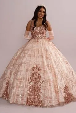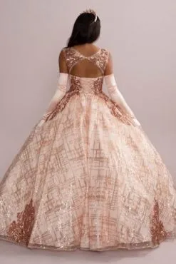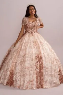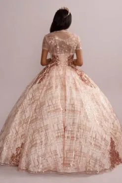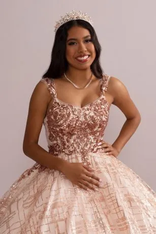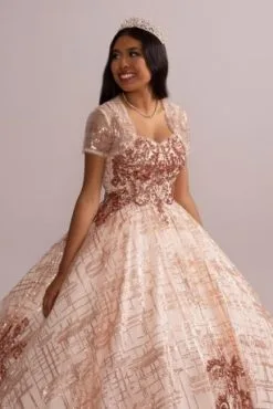 Look like royalty in this dazzling quinceanera ball gown, featuring a check-patterned sequin tulle skirt and matching removable bolero.