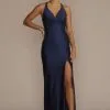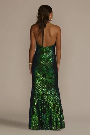 A glistening pattern of sequins add undeniably sexy shine to this sheath dress styled with a dramatic plunging halter neckline. If a bombshell prom look is what you’re after, this is it!
