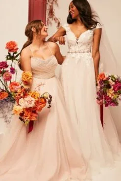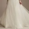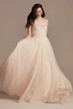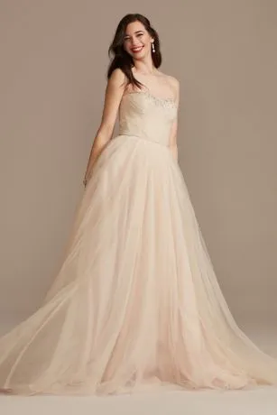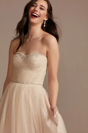 Prepare to wow the crowd in this sophisticated strapless wedding dress featuring a ruched bodice with corset boning, a beaded waistband, and a timeless tulle ball gown skirt. The sweetheart neckline is adorned with ten different kinds of rhinestones, opals, and beads to create a subtle shimmer. Comes with removable spaghetti straps.