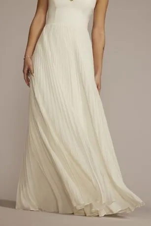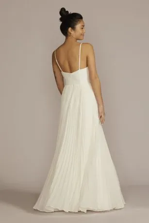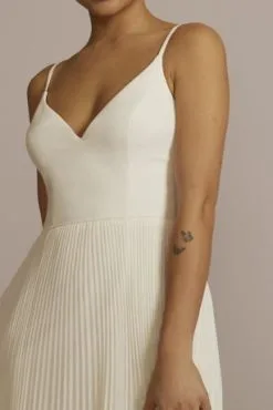 A modern pleated skirt elevates the classic A-line silhouette. Spaghetti straps and a deep V-neckline are as seductive as they are sweet and pair beautifully with the artful piping on the waistline.