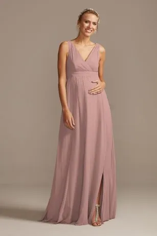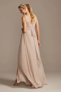 This luxurious soie chiffon bridesmaid dress features a flattering surplice bodice and cummerbund-style waistband. Its flowy side-slit skirt is ideal for showing off strappy heels or sashaying across the dance floor.