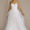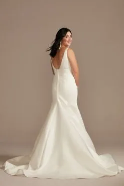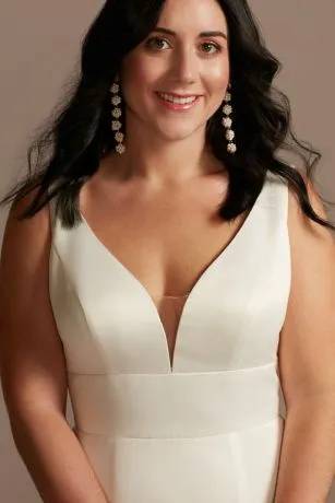 Clean lines and sleek satin pair up for a mermaid wedding dress that elongates your figure and enhances curves. The illusion plunge, curved V-neckline is paired with a structured, exposed back for a sexy touch.