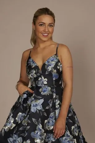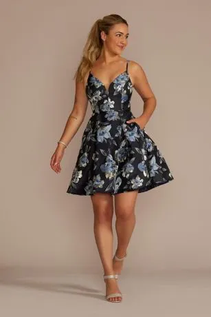 This short A-line dress features light-catching metallic brocade flowers, a plunging V-neckline, handy pockets, and a full pleated skirt made for twirling. With your best pair of heels, this look is perfect for homecoming.