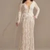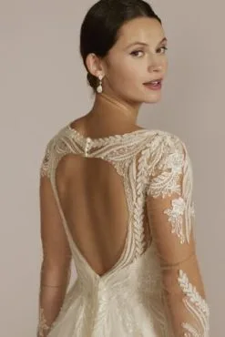 Get ready for a romantic walk down the aisle in this dreamy beaded A-line tulle dress featuring two types of lace appliques on the bodice, long sleeves, and a beautiful open back. The plunging V-neckline completes the look with a hint of drama.