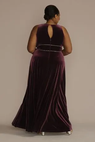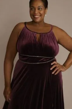 When at your next special occasion, don’t forget to also celebrate how beautiful you look and feel in this plus size luxe A-line. Classic, soft velvet is given a modern spin with keyhole details and waist embellishments.