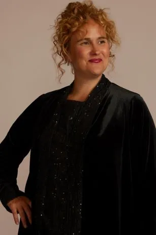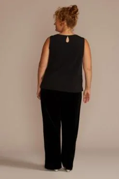 Nothing should ever dull mom’s sparkle! This sophisticated plus size three-piece pantsuit enhances her shine with a scoop neck sequin tank, soft velvet pants, and a matching long sleeve jacket.