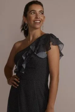 Polka dots are always a good idea! The playful pattern covers this party dress, from the voluminous statement ruffle sleeve through the thigh-high skirt slit, turning a classic A-line into anything but.