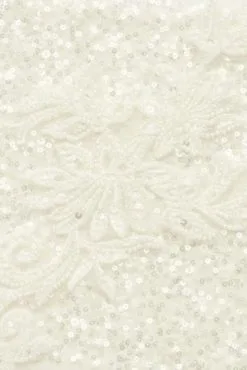 Elevate your bridal glamour in a fully beaded sheath wedding gown. Pouf shoulders add regal detail to the lace-adorned long sleeves while a dramatic 100 inch chapel train spills from beneath a daring open-back. This gown is lined in power mesh ensuring a supportive, figure-flattering silhouette for every bride and topped with a horsehair hemline that lays perfectly, every time.