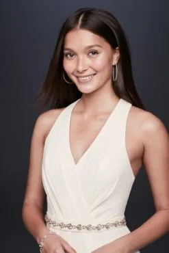 A chic look for a modern wedding or any wedding event, this flattering draped crepe jumpsuit features a crystal-embellished rose gold belt and a sleek, angular racerback.