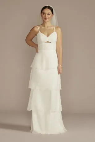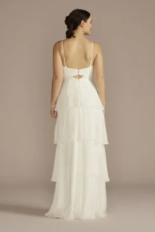 This recycled chiffon wedding dress is the perfect combination of flirty and elegant, with a bodice cutout, pleated waistband, and twirl-worthy tiered skirt.