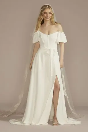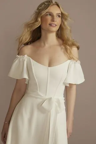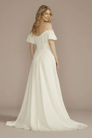 Thoughtfully designed with recycled crepe fabric, this wedding dress is perfect for the boho bride. Off-the-shoulder ruffle sleeves add fun dimension to the fitted corset bodice, while a skirt slit brings a sexy touch. A pretty sash defines the waist and ties the whole look together.