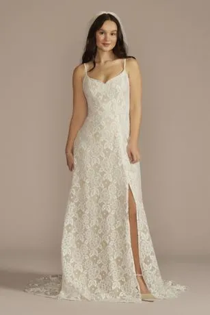 Walk down the aisle in this simply romantic wedding dress, designed with recycled fabrics. Detailed with allover floral lace, spaghetti straps and a soft sweetheart neckline. The side slit completes the look with just a hint of drama.