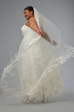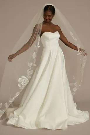 This tulle chapel veil channels bridal romance with a sustainable twist featuring recycled floral lace overlays that frame your figure.