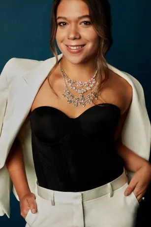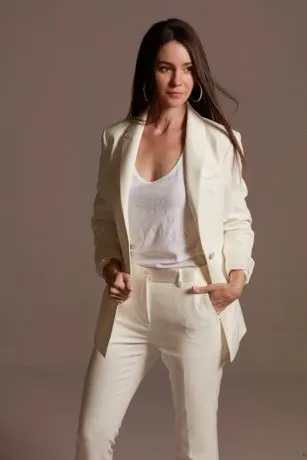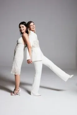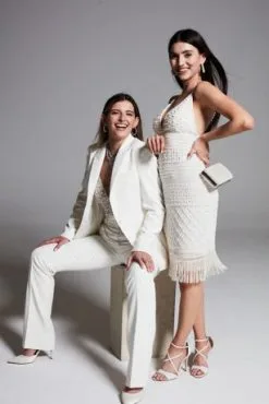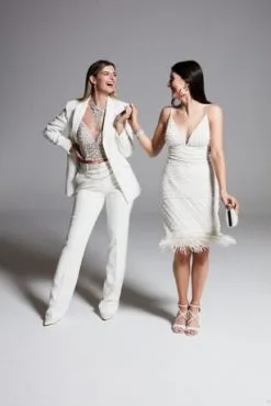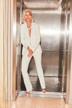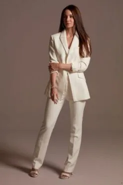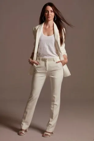 Featuring a satin waistband and a relaxed leg fit, these suit pants pair beautifully with a coordinating jacket and a bustier or tank.