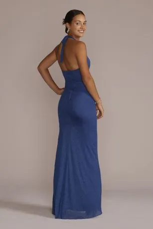 This long crepe glitter dress is party-perfect with timeless and trendy details, alike. The halter neck is a staple, while allover ruching and a thigh-high slit add a modern edge.