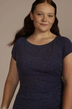 This cap sleeve sheath brings together high-fashion and low-key elements for a one-of-a-kind prom look. A timeless sheath silhouette brings elegance and comfort, while light-catching glitter knit fabric infuses the right amount of youthfulness.