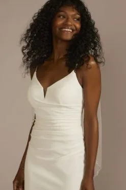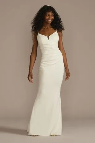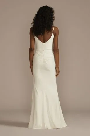Both modern and fresh, this simple sheath wedding gown is anything but. Alluring ruching through the bodice carries to the back, highlighting your curves and enhancing the effortless silhouette. Dainty spaghetti straps and a V-neckline allow for virtually any accessories to play up your personality.