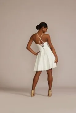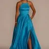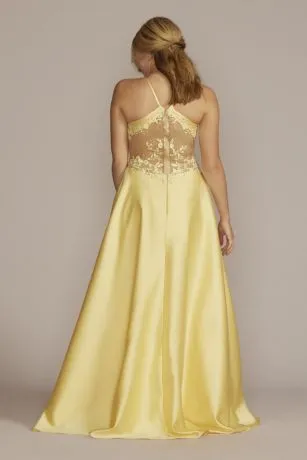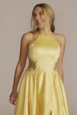 The lustrous satin on this halter gown becomes even more enviable with the addition of illusion side cutouts on the bodice, complete with crystal embellishments. Perfect for a memorable prom look.